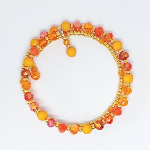 Zo vrolijk, deze armbandjes. Twee wikkelingen om de pols op memory wire*! Lekker gemakkelijk, geen slotje en het past altijd. Met bijpassend zelfgemaakt bedeltje. Ook leuk te combineren met allerlei andere vrolijke kleurtjes.